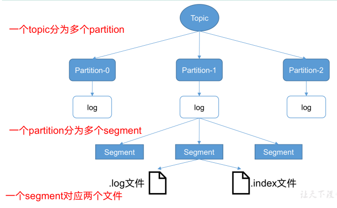 由于生产者生产的消息会不断追加到log文件末尾,为防止log文件过大导致数据定位效率低下,Kafka采取了分片和索引机制,将每个partition分为多个segment。每个segment对应两个文件——“.index”文件和“.log”文件。这些文件位于一个文件夹下,该文件夹的命名规则为:topic名称+分区序号。例如,test这个topic有三个分区,则其对应的文件夹为test-0,test-1,test-2