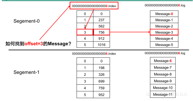 “.index”文件存储大量的索引信息,“.log”文件存储大量的数据,索引文件中的元数据指向对应数据文件中message的物理偏移地址。