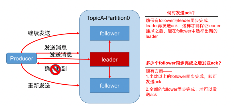 为保证producer发送的数据,能可靠的发送到指定的topic,topic的每个partition收到producer发送的数据后,都需要向producer发送ack(acknowledgement确认收到),如果producer收到ack,就会进行下一轮的发送,否则重新发送数据。