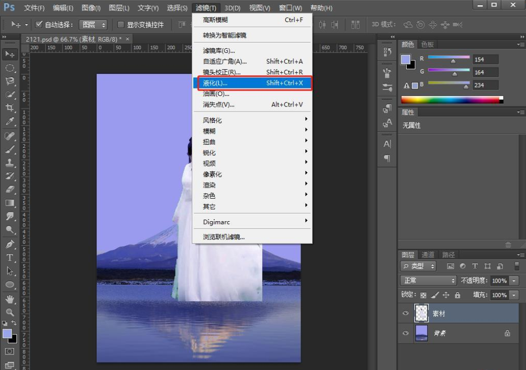 2、在ps主界面,我们通过点击【滤镜】-【液化】。