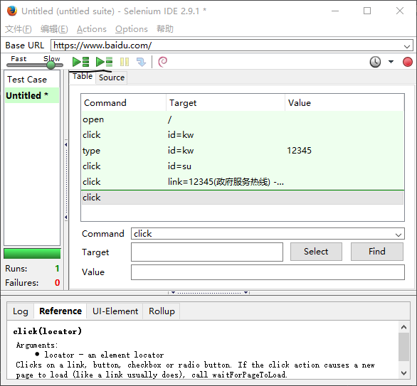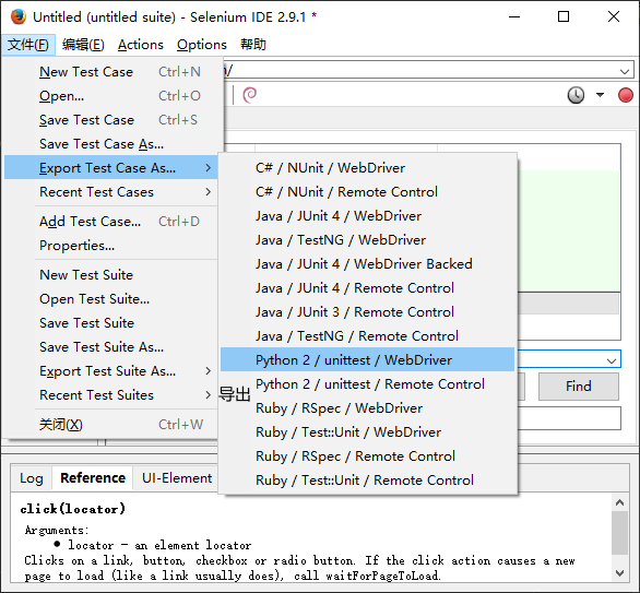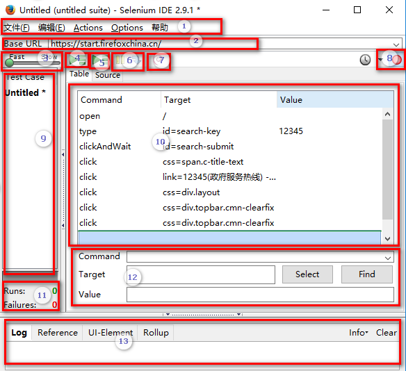 1.文件:创建、打开和保存测试案例和测试案例集。编辑:复制、粘贴、删除、撤销和选择测试案例中的所有命令。Options : 用于设置seleniunm IDE。