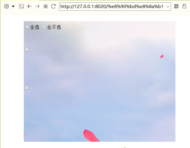1 <!DOCTYPE html> 2 <html> 3 <head> 4 <link rel="stylesheet" href="../CSS/new_file.css" /> 5 <meta charset="UTF-8"> 6 <title></title> 7 </head> 8 <body> 9 <div class="mr-cont"> 10 <form> 11 <label><input type="radio" name="all">全选</label> 12 <label><input type="radio" name="all">全不选</label> 13 <input type="checkbox" class="checkbox1" /> 14 <input type="checkbox" class="checkbox1" /> 15 16 </form> 17 </div> 18 </body> 19 </html>