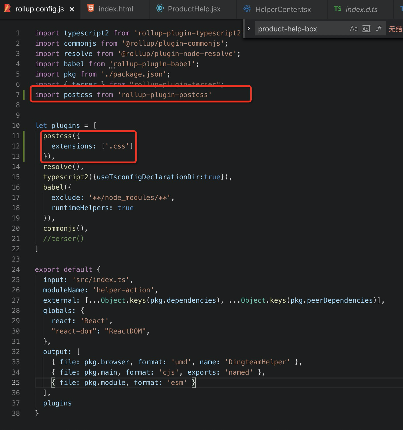 import typescript2 from 'rollup-plugin-typescript2'; import commonjs from '@rollup/plugin-commonjs'; // 插件将CommonJS模块转换为 ES2015 提供给 Rollup 处理 import resolve from '@rollup/plugin-node-resolve'; // 帮助 Rollup 查找外部模块,然后安装 import babel from 'rollup-plugin-babel'; // 方便使用 javascript 的新特性,es新特性的解析 import pkg from './package.json'; import { terser } from "rollup-plugin-terser"; import postcss from 'rollup-plugin-postcss' let plugins = [ postcss({ extensions: ['.css'] }), resolve(), typescript2({useTsconfigDeclarationDir:true}), babel({ exclude: '**/node_modules/**', runtimeHelpers: true }), commonjs(), //terser() ] export default { input: 'src/index.ts', moduleName: 'helper-action', external: [...Object.keys(pkg.dependencies), ...Object.keys(pkg.peerDependencies)], // 外部引用 防止将某些 import 的包(package)打包到bundle 中,而是在运行时(runtime)再去从外部获取这些扩展依赖 globals: { react: 'React', "react-dom": "ReactDOM", }, output: [ { file: pkg.browser, format: 'umd', name: 'DingteamHelper' }, { file: pkg.main, format: 'cjs', exports: 'named' }, { file: pkg.module, format: 'esm' } ], plugins }