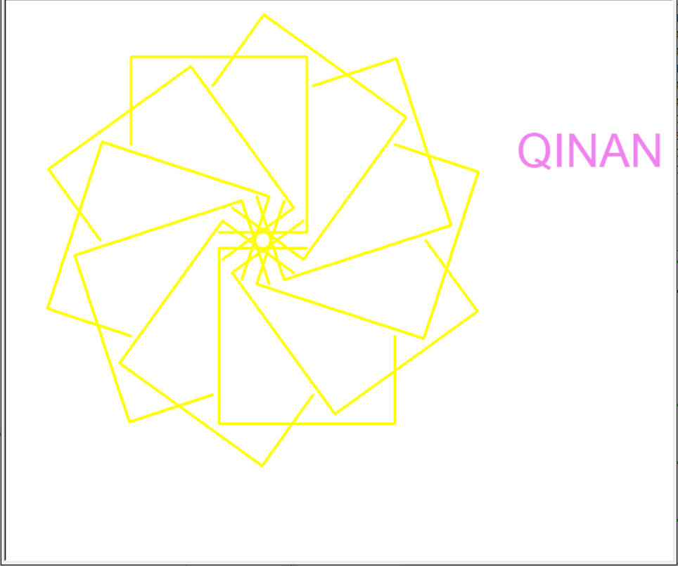 1 import turtle 2 turtle.pensize(3) 3 turtle.pencolor("yellow") 4 turtle.penup() 5 turtle.goto(60,-60) 6 turtle.pendown() 7 turtle.seth(-90) 8 for i in range(10): 9 turtle.fd(100) 10 turtle.right(90) 11 turtle.fd(200) 12 turtle.right(90) 13 turtle.fd(200) 14 turtle.right(90) 15 turtle.fd(100) 16 turtle.penup() 17 turtle.right(90) 18 turtle.fd(100) 19 turtle.right(90) 20 turtle.fd(200) 21 turtle.pendown() 22 turtle.right(18) 23 turtle.penup() 24 turtle.goto(200,120) 25 turtle.color("violet") 26 turtle.write("QINAN", font=('Arial', 40, 'normal')) 27 turtle.hideturtle()
