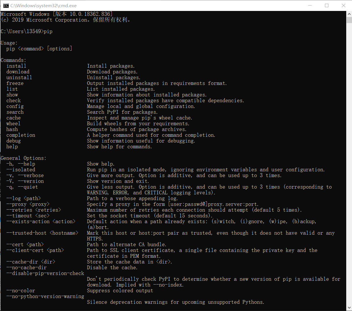 在CMD控制台直接输入pip,看是否有以下界面显示,出现如下界面即可正常使用pip功能