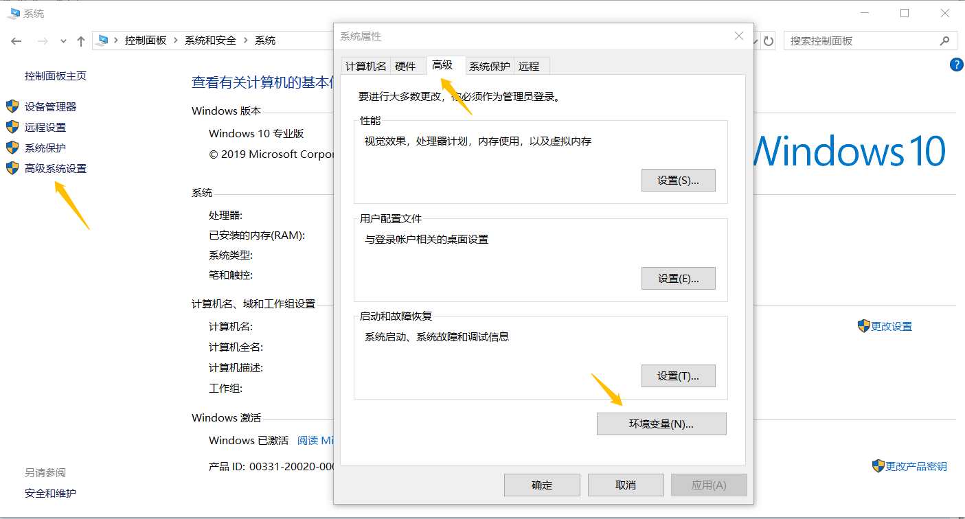 安装完成后我们在CMD控制台输入adb是没有反应的,因为我们还没有配置好adb的环境变量,我们可以右键点击我的电脑,选择属性,点击高级系统设置,在高级中点击环境变量