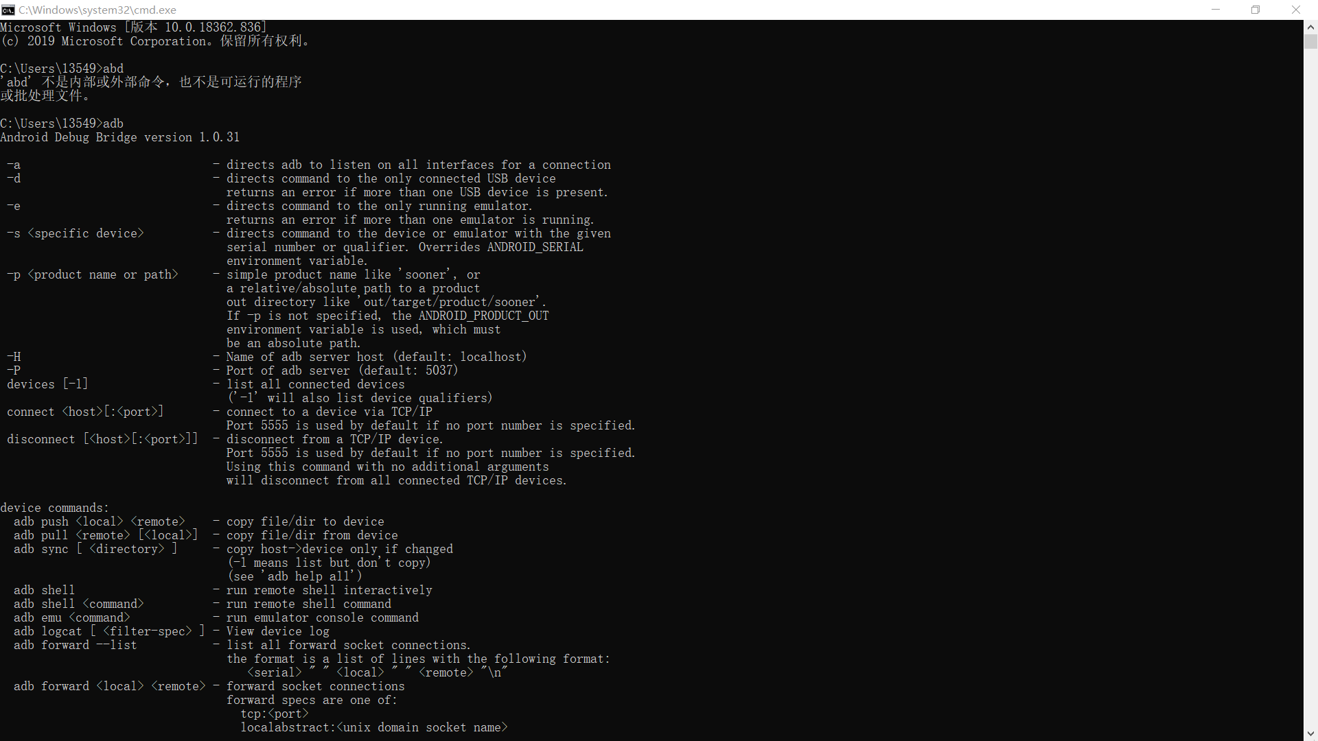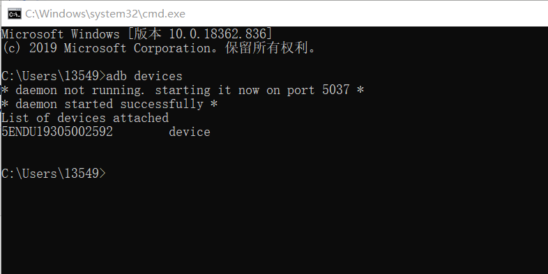 然后在CMD控制台,执行命令 adb devices可显示当前手机连接的端口号