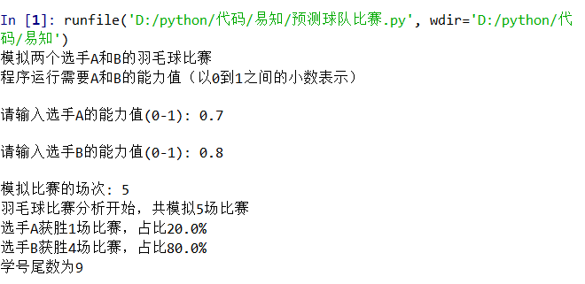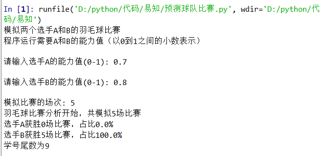 1 # -*- coding: utf-8 -*- 2 """ 3 Created on Tue Jun 9 11:18:48 2020 4 5 @author: 13549 6 """ 7 8 from random import random 9 #第一阶段 10 def printIntro(): 11 print("模拟两个选手A和B的羽毛球比赛") 12 print("程序运行需要A和B的能力值(以0到1之间的小数表示)") 13 def getInputs(): 14 a = eval(input("请输入选手A的能力值(0-1): ")) 15 b = eval(input("请输入选手B的能力值(0-1): ")) 16 n = eval(input("模拟比赛的场次: ")) 17 return a, b, n 18 def simNGames(n, probA, probB): 19 winsA, winsB = 0, 0 20 for i in range(n): #将模拟n场比赛分解为n次模拟一场比赛 21 scoreA, scoreB = simOneGame(probA, probB) 22 if scoreA > scoreB: 23 winsA += 1 24 else: 25 winsB += 1 26 return winsA, winsB 27 def printSummary(winsA, winsB): 28 n = winsA + winsB 29 print("羽毛球比赛分析开始,共模拟{}场比赛".format(n)) 30 print("选手A获胜{}场比赛,占比{:0.1%}".format(winsA, winsA/n)) 31 0.8 32 print("选手B获胜{}场比赛,占比{:0.1%}".format(winsB, winsB/n)) 33 def main(): 34 printIntro() 35 probA, probB, n = getInputs() 36 winsA, winsB = simNGames(n, probA, probB) 37 printSummary(winsA, winsB) 38 #第二阶段 39 def simOneGame(probA, probB): 40 scoreA, scoreB = 0, 0 41 serving = "A" 42 while not gameOver(scoreA, scoreB): 43 if serving == "A": 44 if random() < probA: 45 scoreA += 1 46 else: 47 serving="B" 48 else: 49 if random() < probB: 50 scoreB += 1 51 else: 52 serving="A" 53 return scoreA, scoreB 54 #第三阶段 55 def gameOver(a,b): 56 if (a>=20 and b>=20): 57 if(abs(a-b)==2 and a<=29 and b<=29): 58 return True 59 60 else: 61 return a==30 or b==30 62 else: 63 return False 64 65 main() 66 67 print("学号尾数为9")