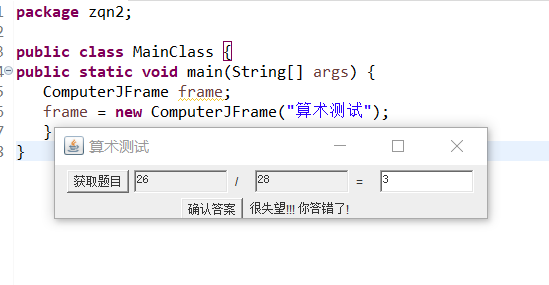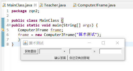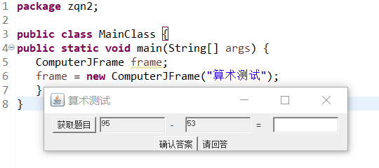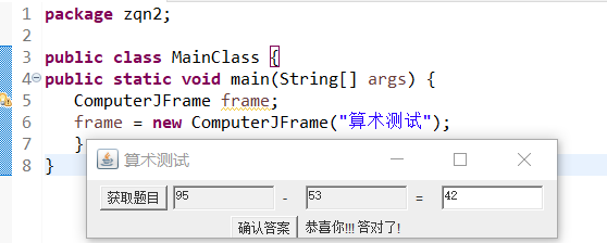 1 package zqn2; 2 3 public class MainClass { 4 public static void main(String[] args) { 5 ComputerJFrame frame; 6 frame = new ComputerJFrame("算术测试"); 7 } 8 }