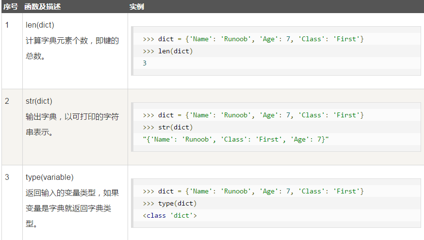 >>> site= {'name': '菜鸟教程', 'alexa': 10000, 'url': 'www.runoob.com'}