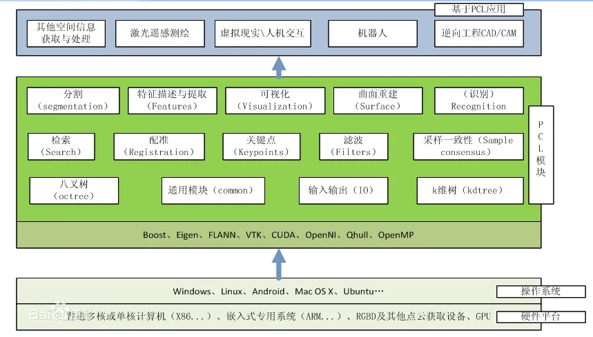 如图PCL架构图所示,对于3D点云处理来说,PCL完全是一个的模块化的现代C++模板库。其基于以下第三方库:Boost、Eigen、FLANN、VTK、CUDA、OpenNI、Qhull,实现点云相关的获取、滤波、分割、配准、检索、特征提取、识别、追踪、曲面重建、可视化等。