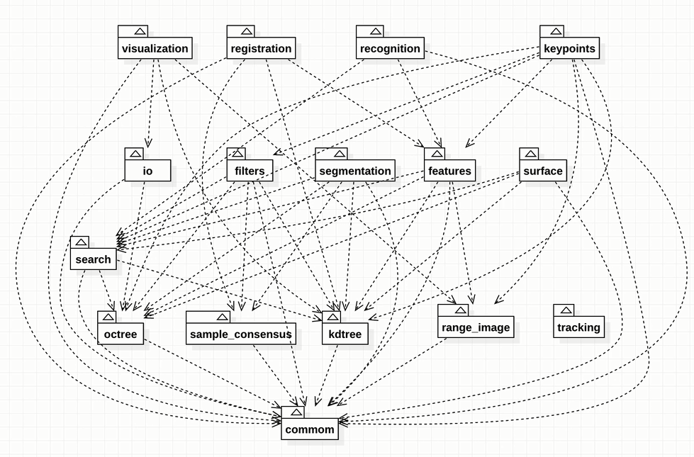 箭头对应的是依赖关系,比如第二层的kdtree依赖于common;第四层的registration有四个箭头,分别是sample_consensus, kdtree, common, features。