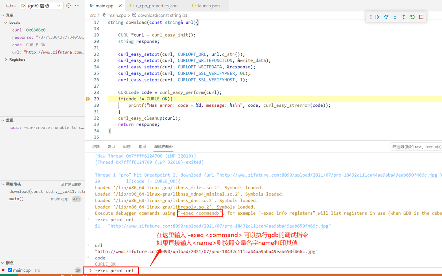 - 好了,我们在main.cpp的29行这个文字左侧点击后后个红点,作为断点,然后按下F5键,看看会怎么样