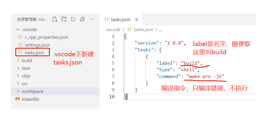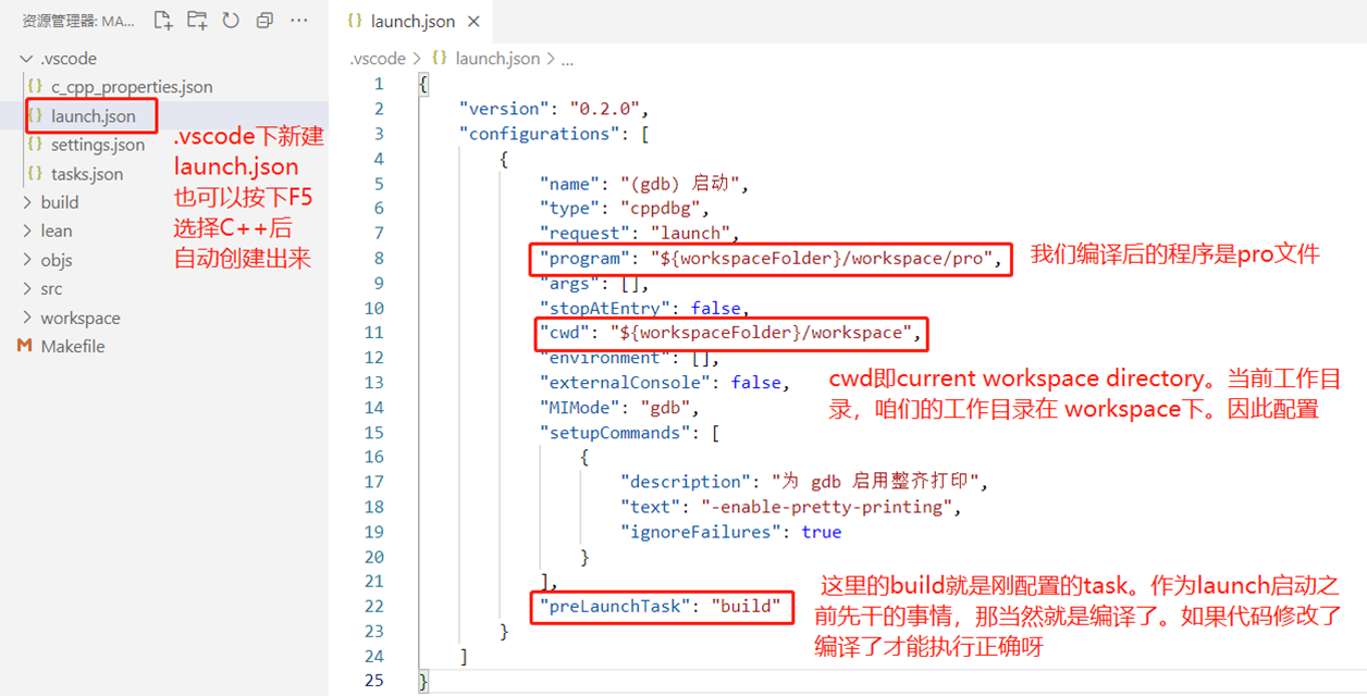 - task.json是配置用来执行调试之前的编译工作。即,按下F5,编译程序,进入调试