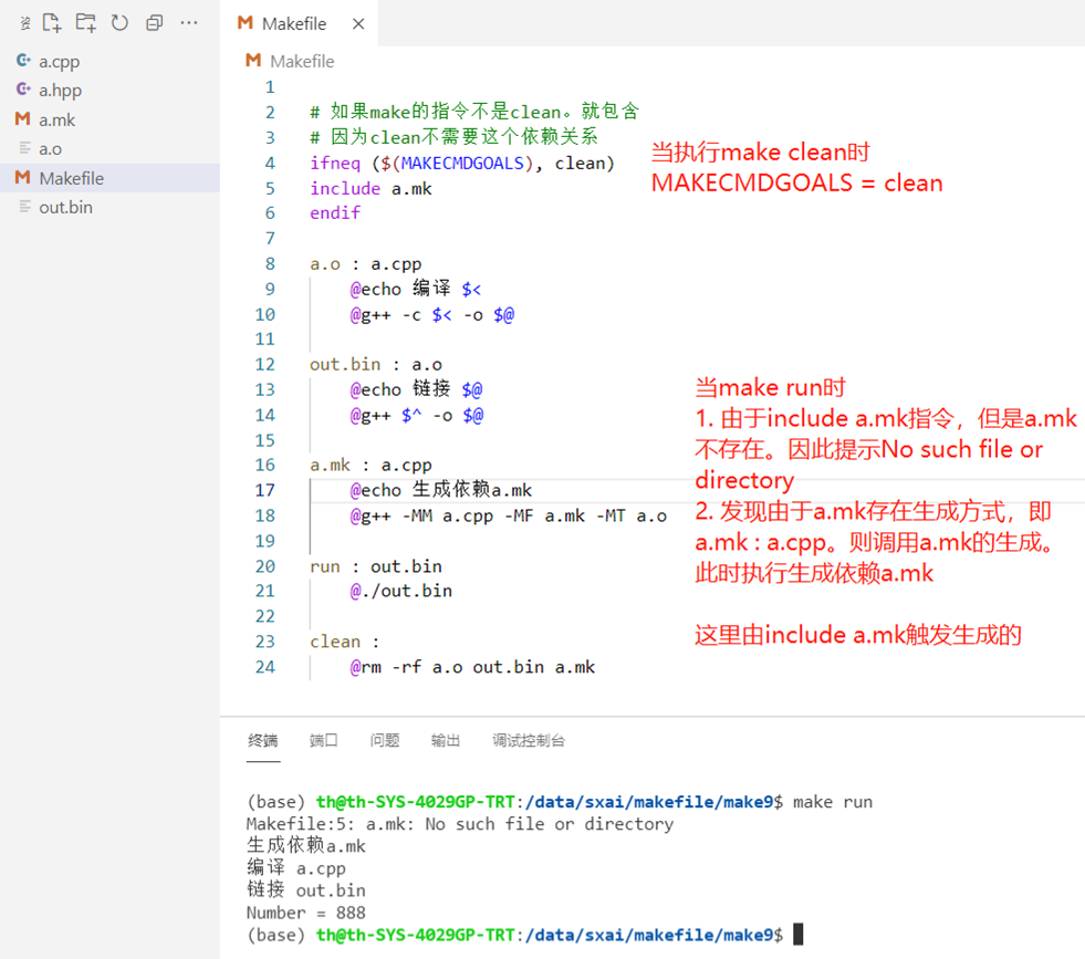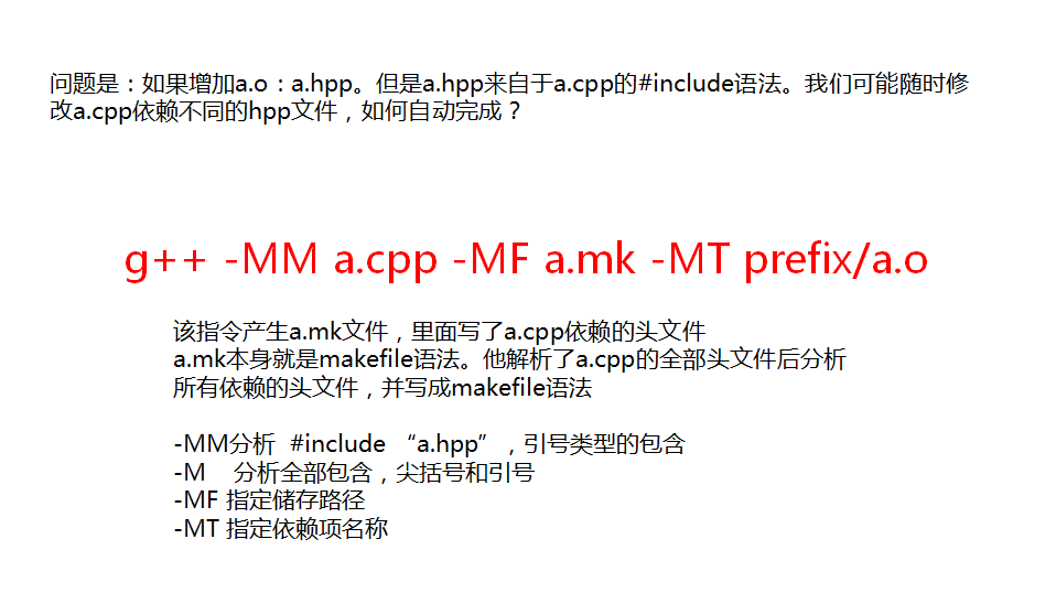 g++ -MM a.cpp -MF a.mk -MT a.o - 为了使编译后的a.mk生效,我们可以通过