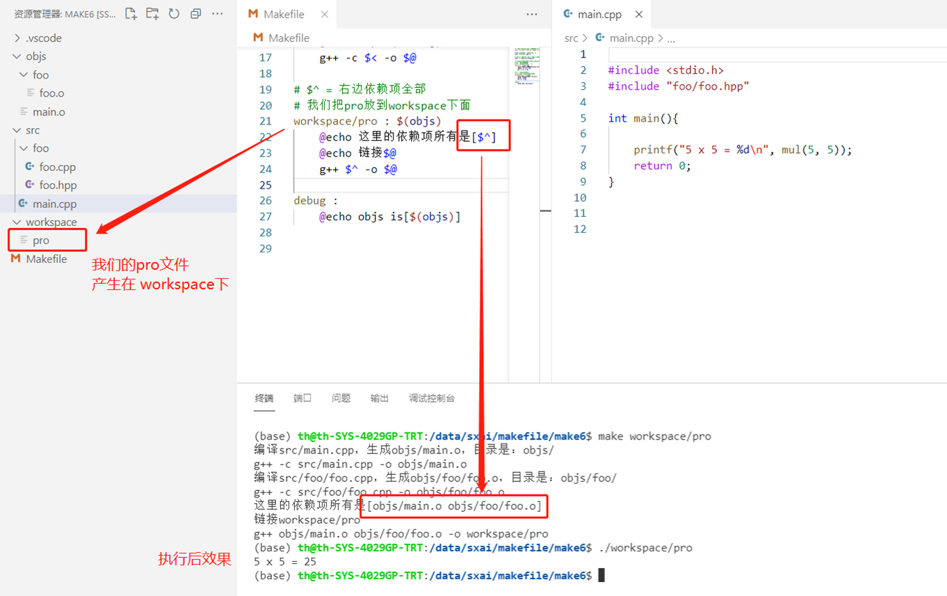 - 我们定义workspace/pro的生成,依赖自所有的o文件。pro是我们的可执行程序