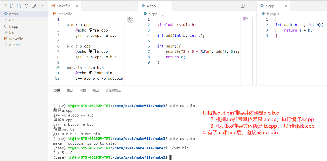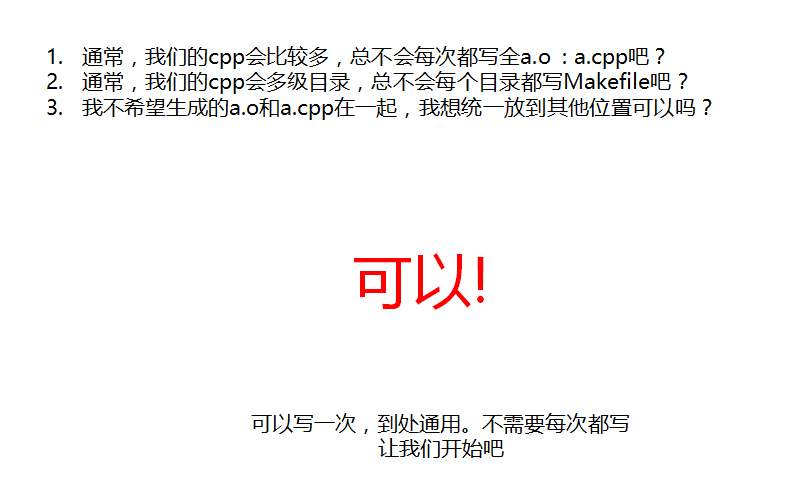 - 这是makefile为我们解决的核心问题,剩下就是如何玩的更方便罢了。比如自动检索a.cpp、b.cpp,自动定义a.o依赖a.cpp。等等