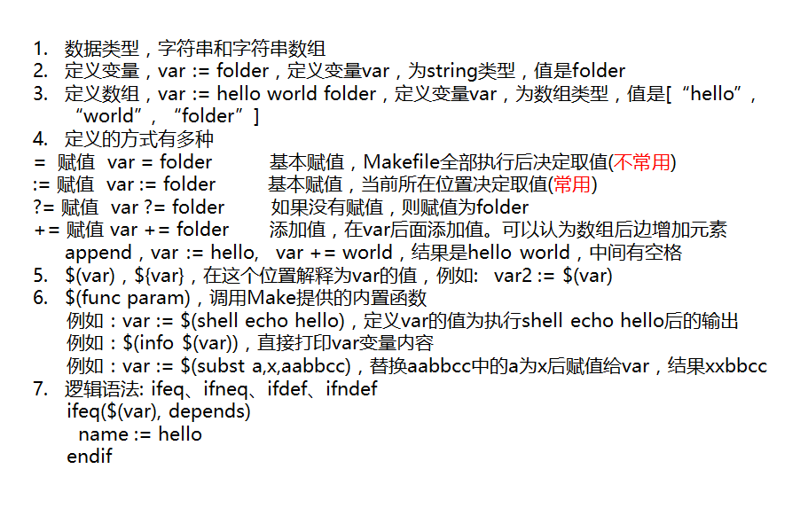 - 变量赋值有4种方式var = 123, var := 123, var ?= 123, var += 123。其中var := 123常用,var += 123常用