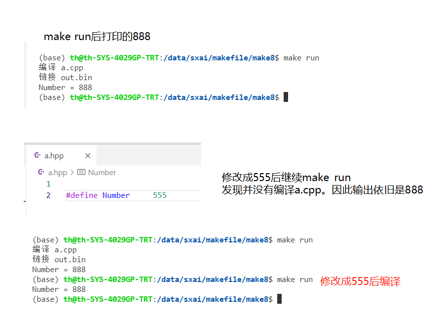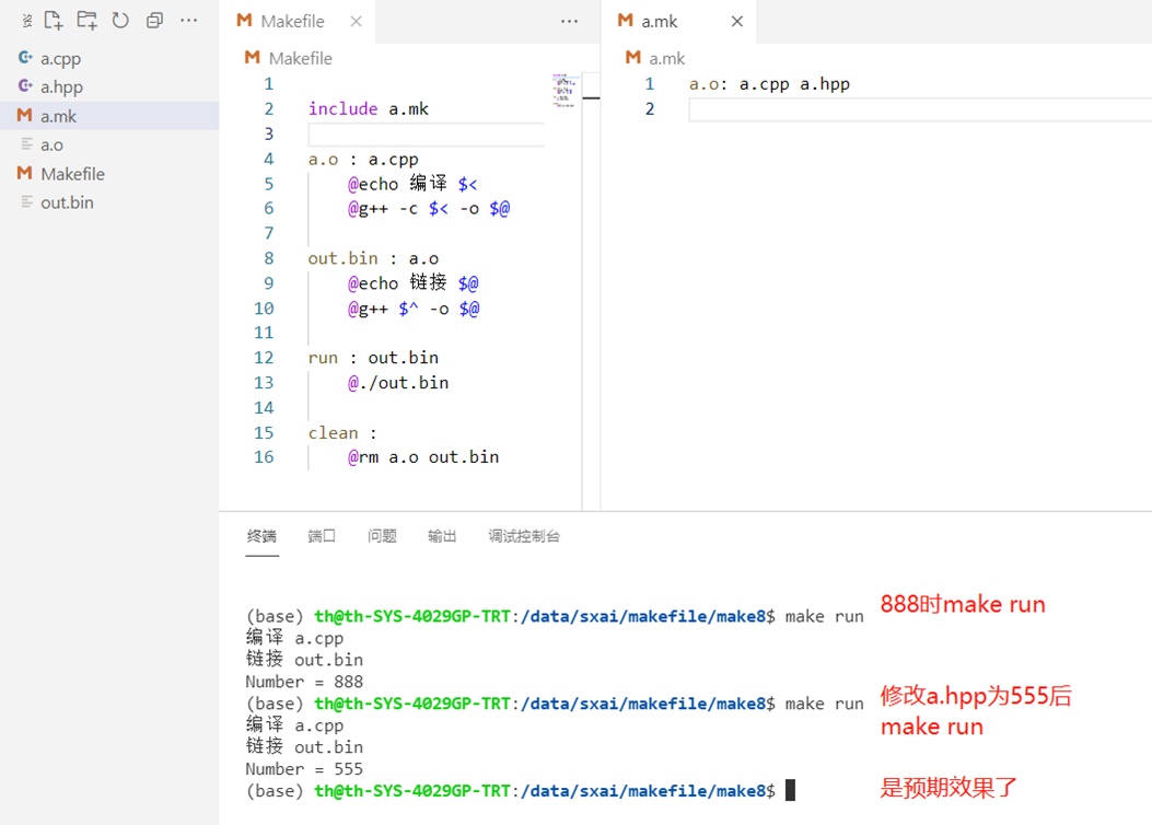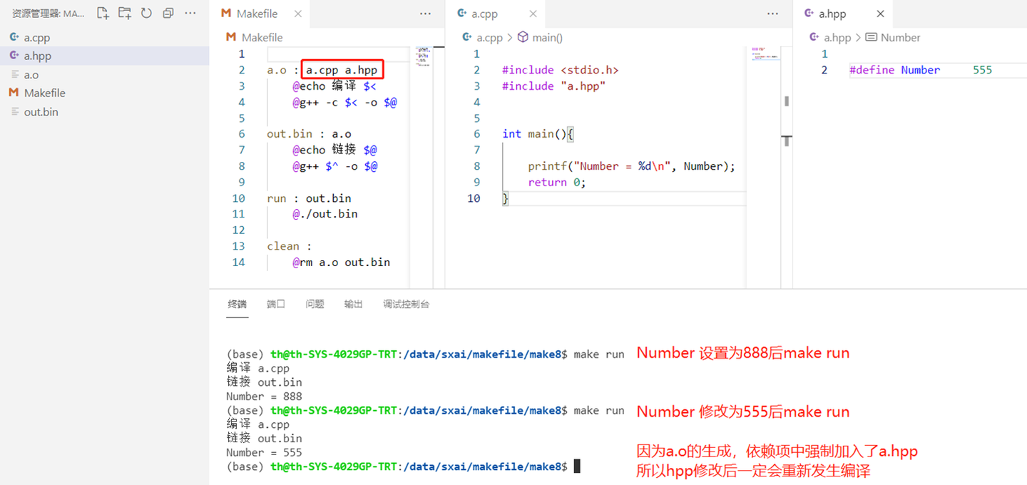 - 原因:缺少a.o对hpp依赖关系的定义。makefile中没有定义a.o : a.hpp,没有要求编译a.cpp需要检查a.hpp的时间