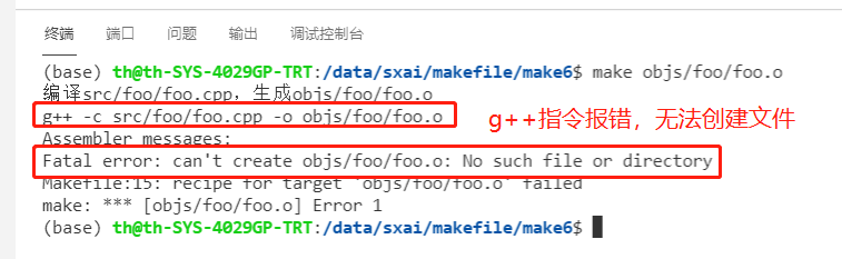 - 原因是,试图创建objs/foo/foo.o文件时失败。因为objs/foo这个目录不存在造成。对于高版本g++(例如9.0)不会报错并为你创建objs/foo目录。
