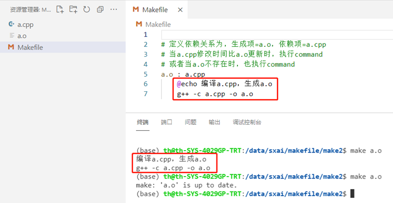 - 第二次执行make a.o时,由于a.cpp时间没有比a.o新,打印a.o is up to date,不需要编译