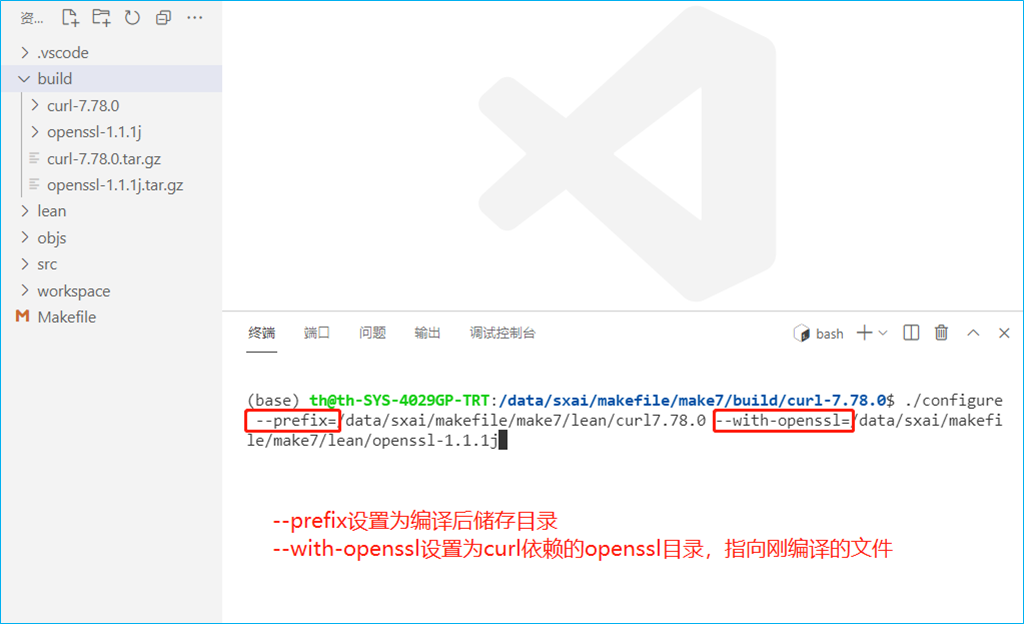 --prefix同样是为了设置安装目录,最后编译好的curl放在哪里--with-openssl指定刚才我们编译安装后的目录./configure同样是为了配置curl生成Makefile文件- 执行