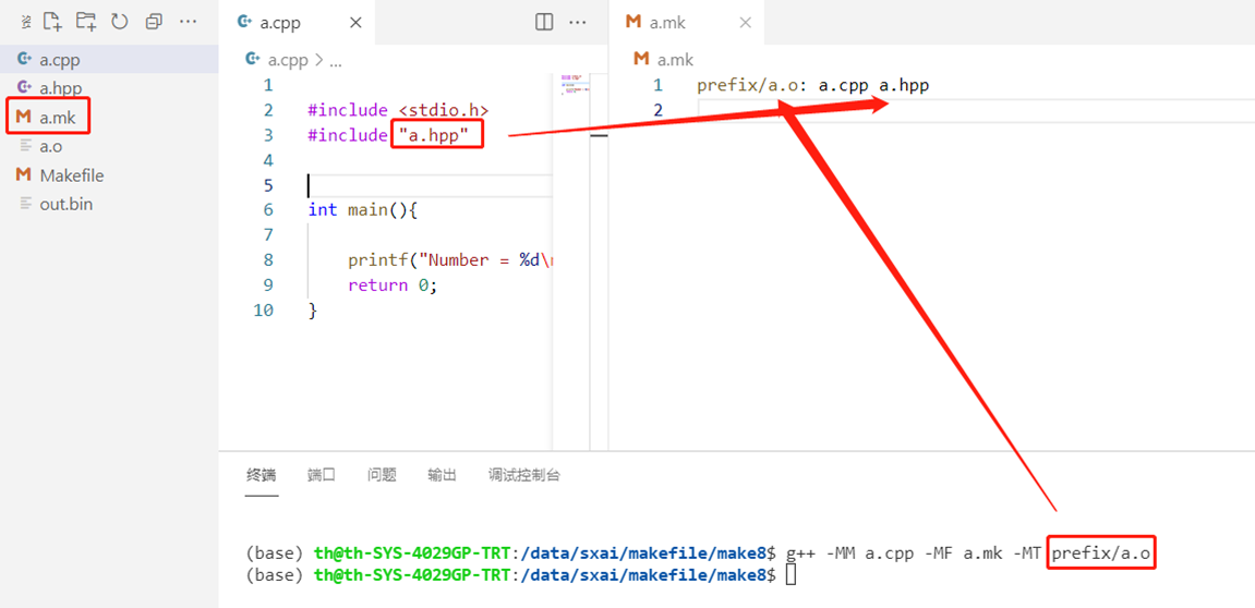 8.3.1 使用g++ -MM a.cpp -MF a.mk -MT prefix/a.o生成makefile文件a.mk