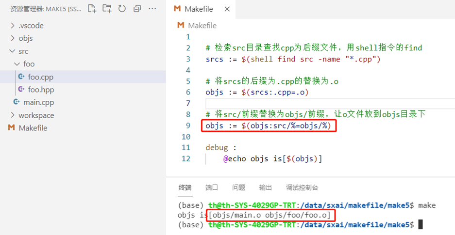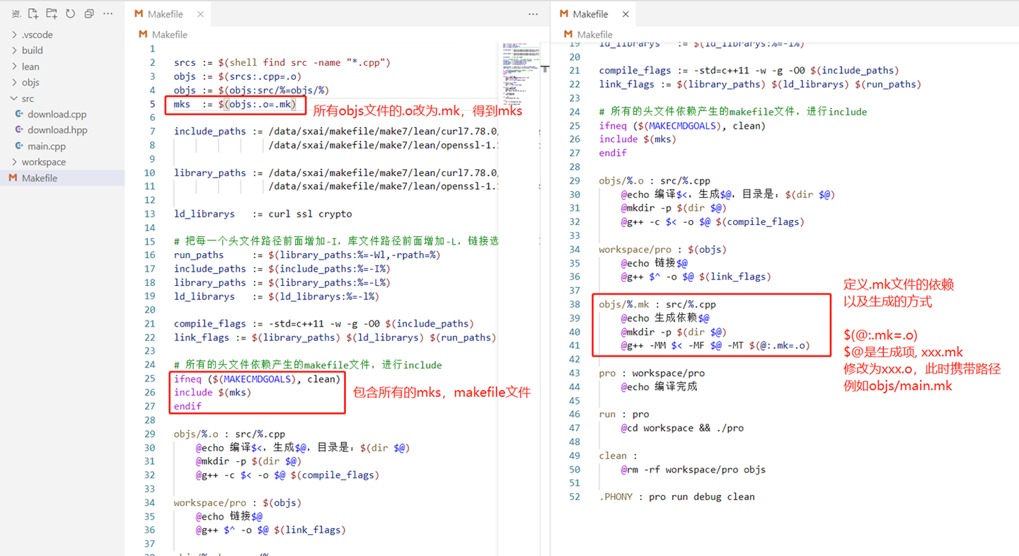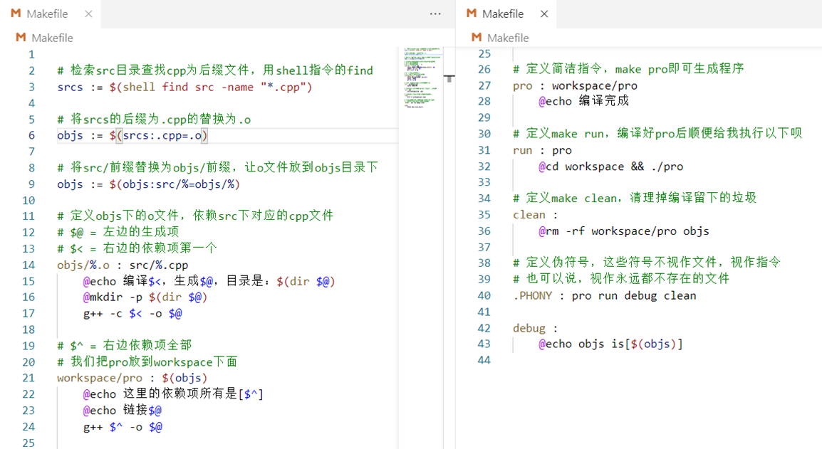 - objs/%.o和src/%.cpp代表了通配依赖关系,模式匹配,%相当于变量部分