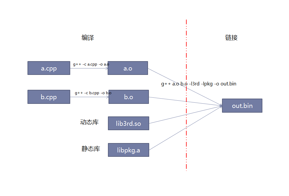 - 链接,多个二进制链接成执行程序:g++ main.o -o main.bin