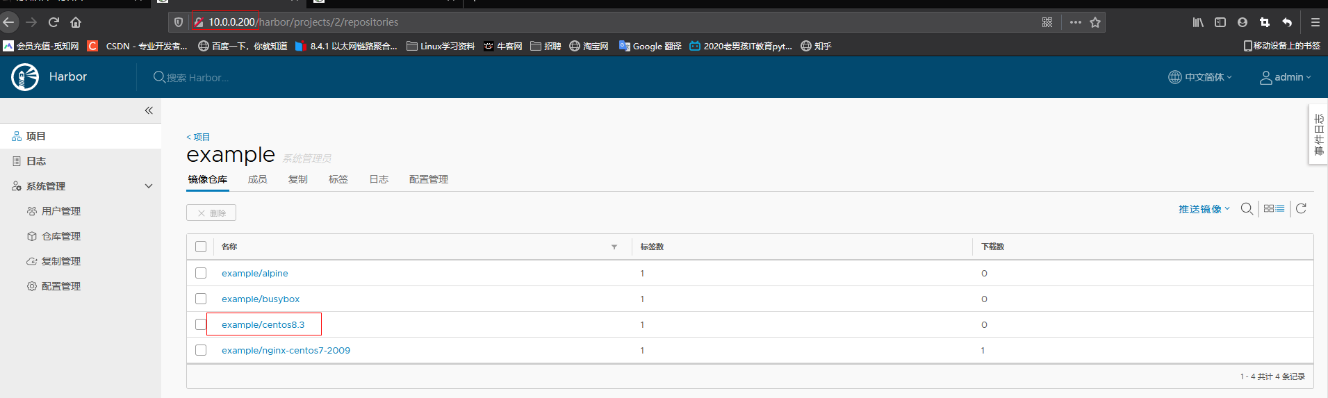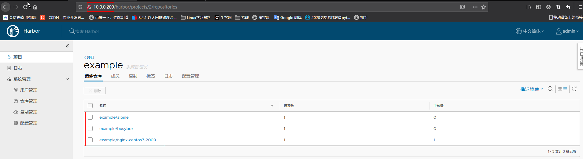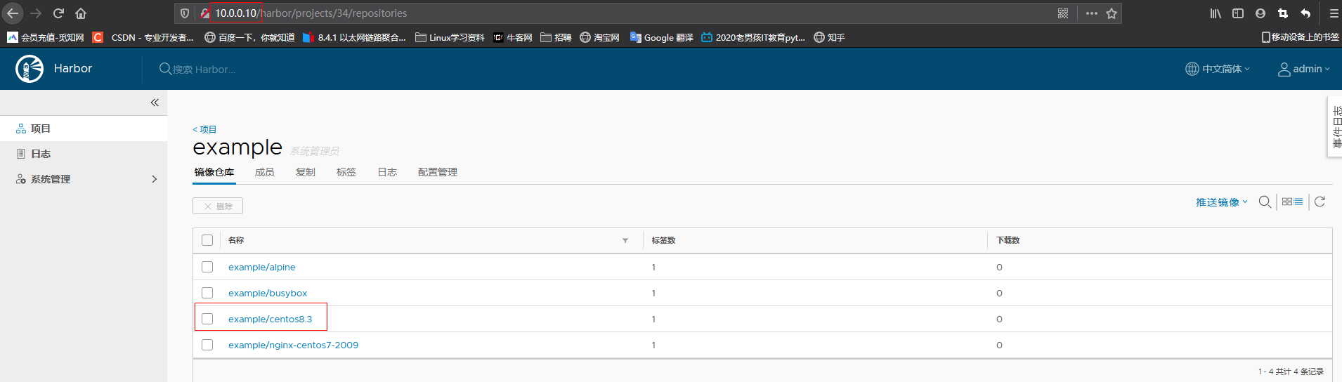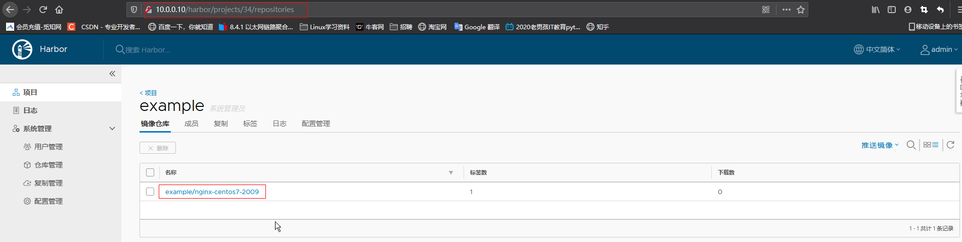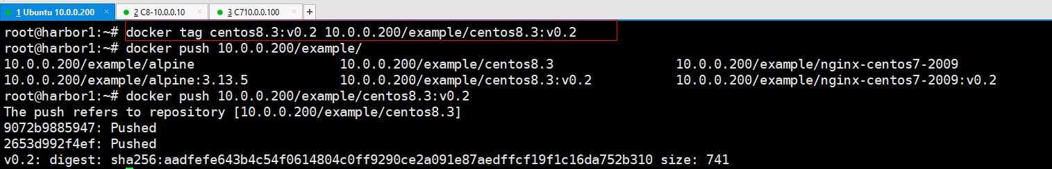 6.进入测试环节,测试是否真正的实现了双方同步;选择一台客户机push一个镜像到harbor(10.0.0.200)的example项目下,看看harbor(10.0.0.10)example是否能够成功的同步。