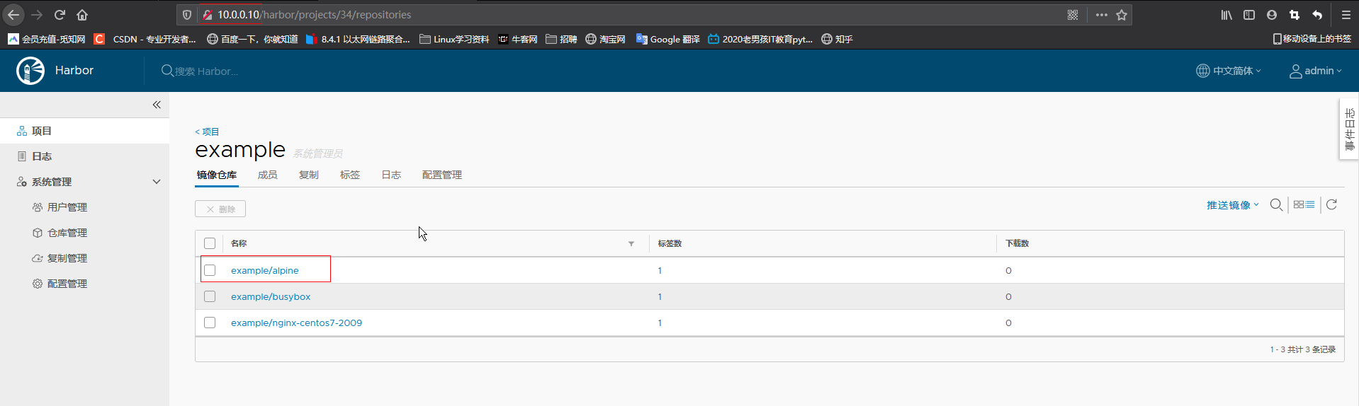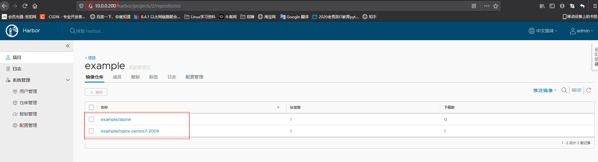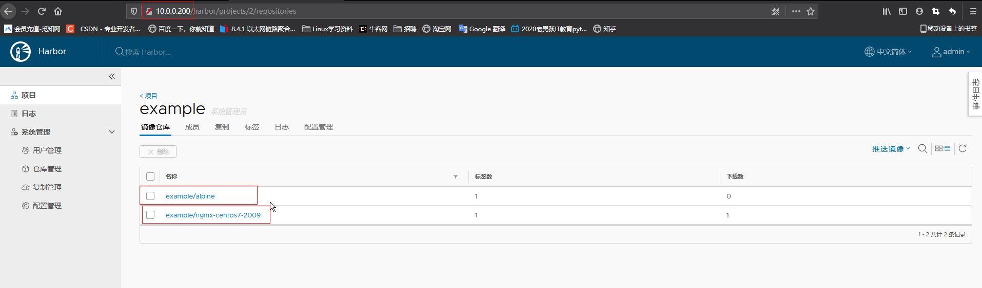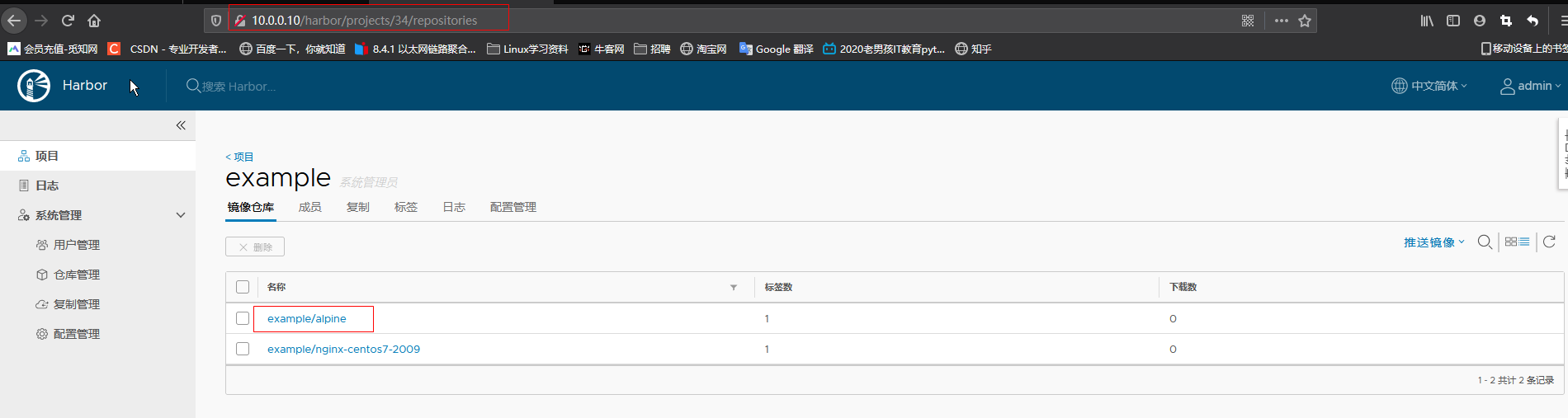 ###在另一个harbor上查看example项目,发现alpine已经被复制过来了。