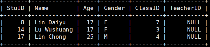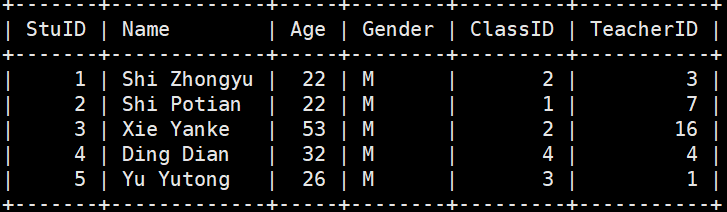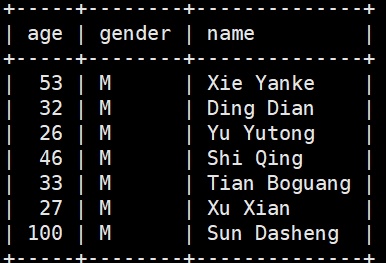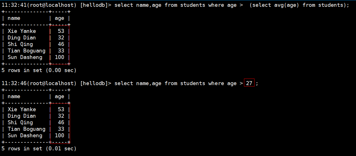 PS:先计算出所有同学的平均年龄,再将平均年龄的结果作为子查询进行比较,即可得出结果,这里平均年龄是27因此拿这个结果设置过滤条件以作验证。