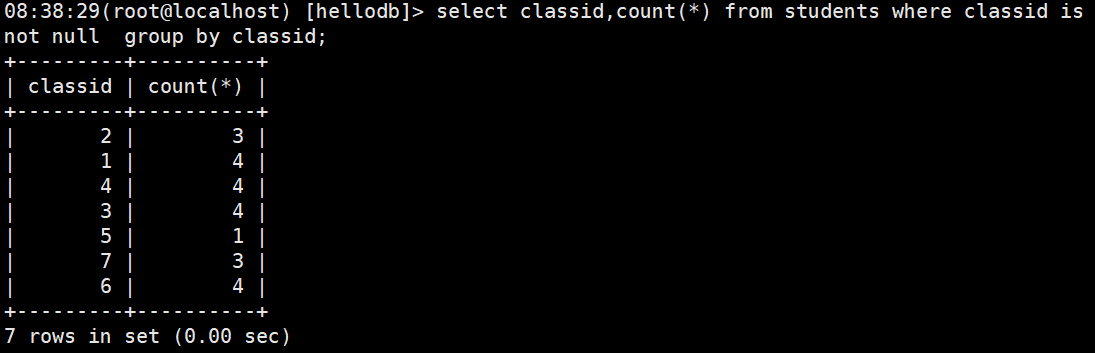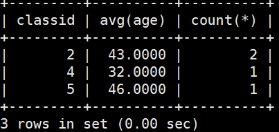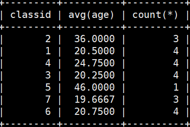 select classid,avg(age),count(*) from students where classid is not null group by classid;