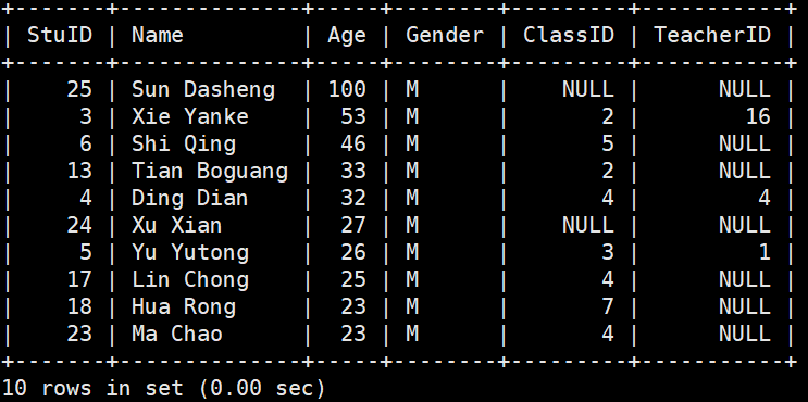 6. 以年龄排序后,显示年龄最大的前10位同学的信息