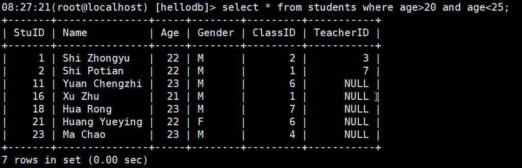 7. 查询年龄大于等于20岁,小于等于25岁的同学的信息