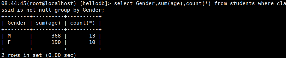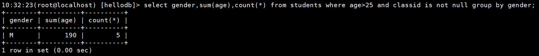select gender,sum(age),count(*) from students where age>25 and classid is not null group by gender;