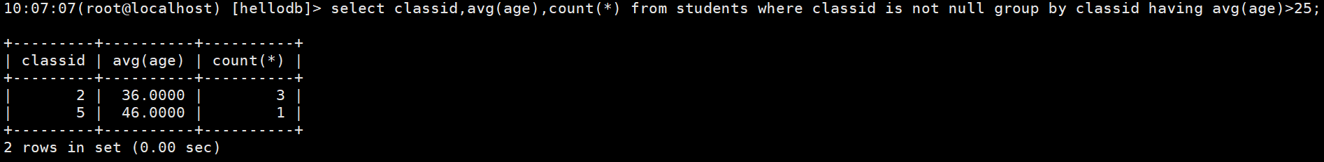 select classid,avg(age),count(*) from students where classid is not null group by classid having avg(age)>25;