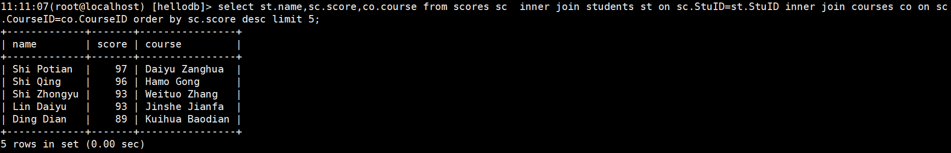 select st.name,sc.score,co.course from scores sc inner join students st on sc.StuID=st.StuID inner join courses co on sc.CourseID=co.CourseID order by sc.score desc limit 5
