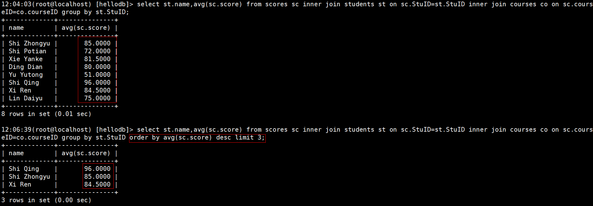 select st.name,avg(sc.score) from scores sc inner join students st on sc.StuID=st.StuID inner join courses co on sc.courseID=co.courseID group by st.StuID order by avg(sc.score) desc limit 3;