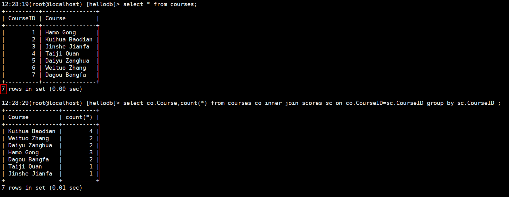 select co.Course,count(*) from courses co inner join scores sc on co.CourseID=sc.CourseID group by sc.CourseID ;