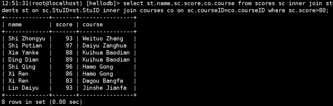 select st.name,sc.score,co.course from scores sc inner join students st on sc.StuID=st.StuID inner join courses co on sc.courseID=co.courseID where sc.score>80;