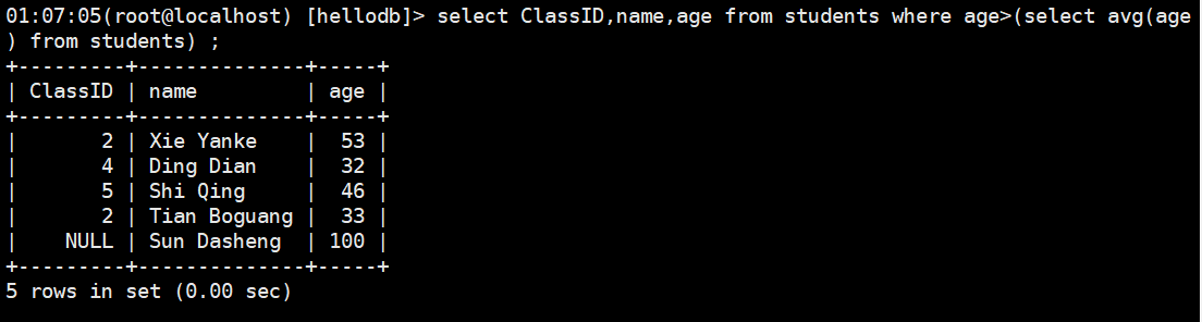 select ClassID,name,age from students where age>(select avg(age) from students);