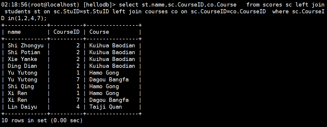 select st.name,sc.CourseID,co.Course from scores sc left join students st on sc.StuID=st.StuID left join courses co on sc.CourseID=co.CourseID where sc.CourseIDD in(1,2,4,7);