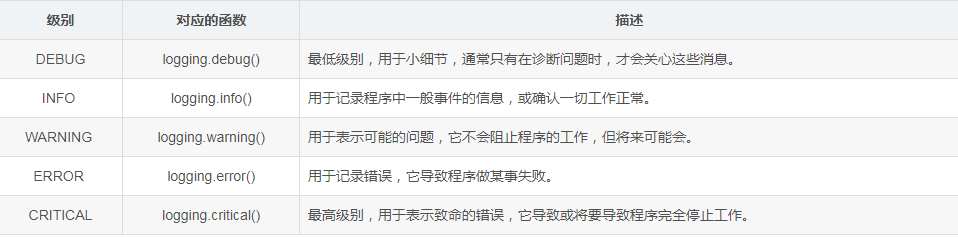 日志级别”提供了一种方式,按重要性对日志消息进行分类。5 个日志级别如表 1 所示,从最不重要到最重要。利用不同的日志函数,消息可以按某个级别记入日志。