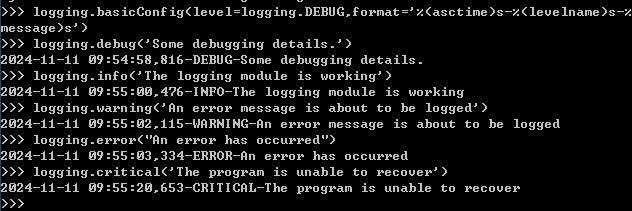 import logging logging.basicConfig(filename="demo.txt",level=logging.DEBUG,format='%(asctime)s-%(levelname)s - %(message)s')