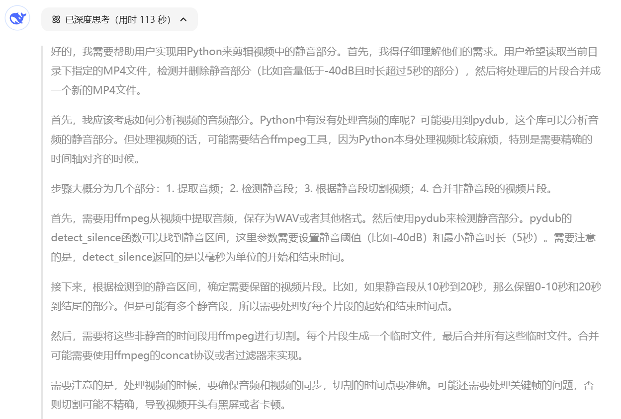首先声明,并不是标题党。全程由AI主导,我只是提供了想法(提示词),确实只用了2分钟就实现了一个剪辑静音视频的小工具。DeepSeek强大的推理+输出模式,整个过程逻辑严密、思路清洗、步骤清楚,不得不感叹AI的强大。废话不多说,本文将把具体步骤说一下,大家可以动手亲自操作验证一遍。