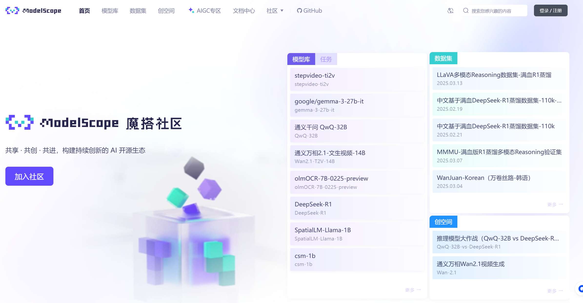 以及modelscope,地址是https://www.modelscope.cn/home,也被称为魔搭社区。