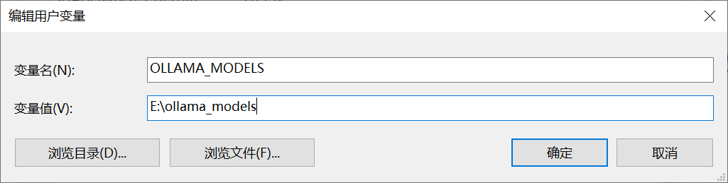 接下来,将ollama的安装路径配置到环境变量,并且将默认的模型文件下载位置配置到环境变量(模型文件一般比较大,配置模型文件位置可以避免ollama将模型文件下载到C盘)。配置模型文件下载位置的方式如下,在环境变量配置时,添加如下键值对。比如我就是放到E盘的ollama_models这个文件夹下。