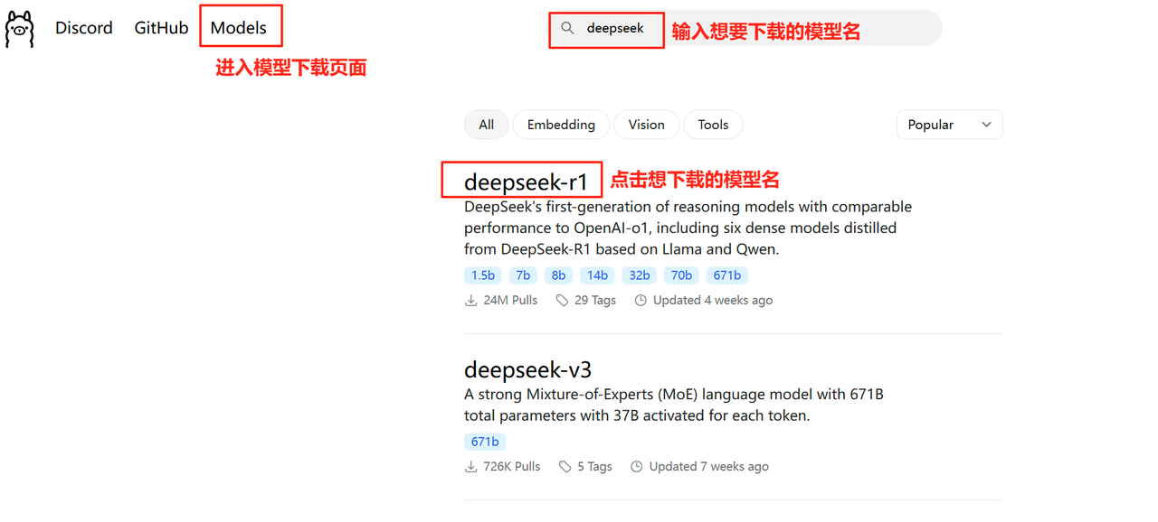 ollama安装好之后,我们既可以使用ollama直接在线拉取指定模型文件,也可以直接使用已经下载好的模型文件。如果你的模型文件已经下载好了的话,直接把这个模型放在刚刚配置好的模型下载位置即可使用。如果之前没有下载模型文件,也可以直接用ollama来帮你下载模型文件。在ollama官网通过模型下载页面选择模型。比如想下载一个deepseek r1的模型文件,如下图所示: