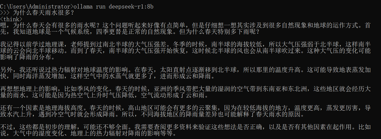 模型文件下载完毕后,如果要运行模型,则直接打开命令行运行ollama run的命令即可,就是第4步下载模型文件的命令。运行后,界面如下,默认是对话模式。